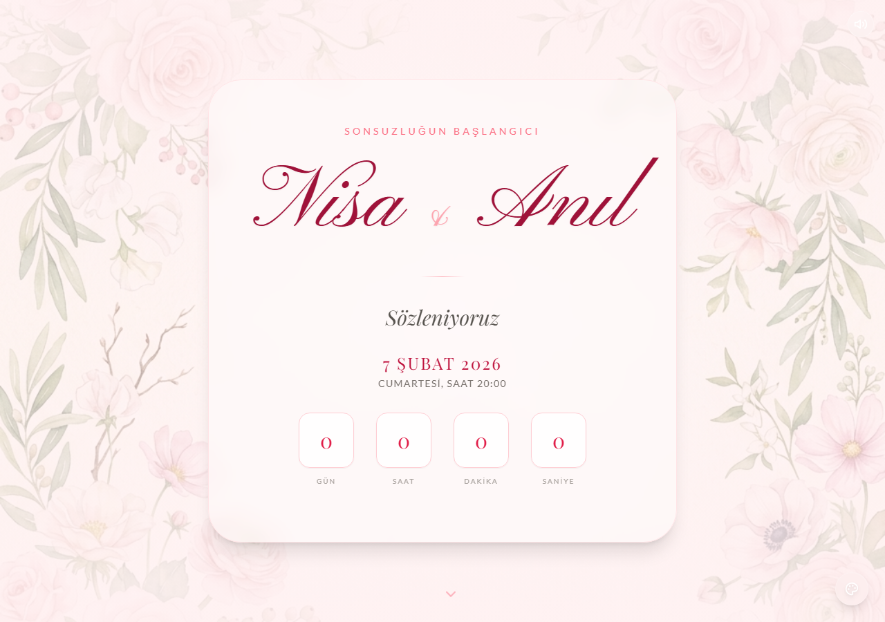 Pembe gül motifleri ve yumuşak renk geçişleriyle bezeli romantik nişan davetiyesi.