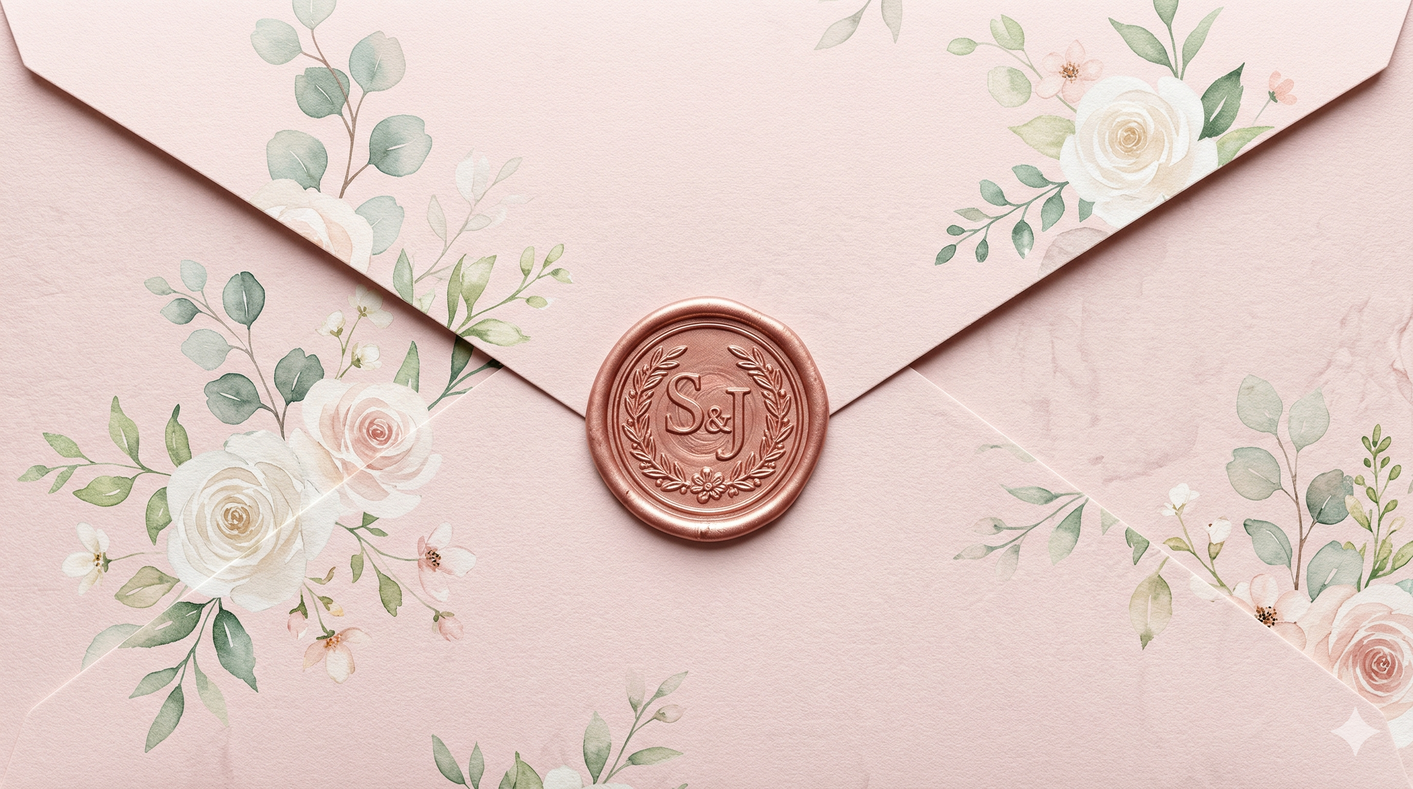 Pudra pembesi ve adaçayı yeşili tonlarında, çiçek motifleriyle bezenmiş zarif davetiye tasarımı.